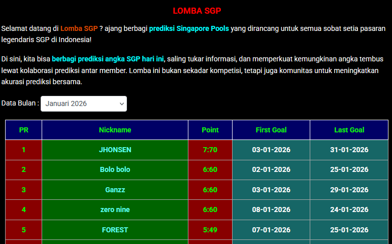 Lomba SGP adalah forum prediksi angka Singapore Pools yang terbuka untuk semua. Tujuan utama dari lomba ini adalah: